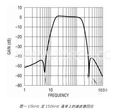 高通截止頻率必須低于最長時間間隔的倒數 (就所示實例而言,高通 fCUTOFF < 1/20μs),而且要盡可能地高,以降低接收器的低頻噪聲 (基頻放大器以及下變頻相位與幅度雜訊)。圖三的下半部分顯示該濾波器的總體響應 (低通加高通濾波器)。