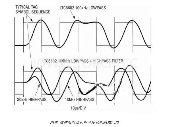 圖三顯示一個實例,即濾波器對一個典型卷標符號序列 (一個“短”的脈沖間隔,接著是一個“長”的脈沖間隔) 的時域響應。低通截止頻率設定為等于最短時間間隔的倒數(fCUTOFF = 1/10μs = 100kHz)。如果低通截止頻率更低,那么訊號躍變和時間間隔將失真得無法識別。高通截止頻率的設置更加定性而不是具體。