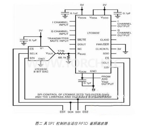 可編程讀取器含有一個高線性度的直接轉換 I 和 Q 解調器、若干低噪聲放大器、一個具可變增益和帶寬的雙信道基頻濾波器、以及一個雙信道模擬數字轉換器(ADC)。雙通道、已匹配和可編程的帶通濾波器 LTC6602 可以優(yōu)化高效能 RFID 讀取器。